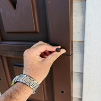 Прикладываем ставню к окну и сверлим отверстие. Для более легкого монтажа отверстие лучше сверлить сверху.